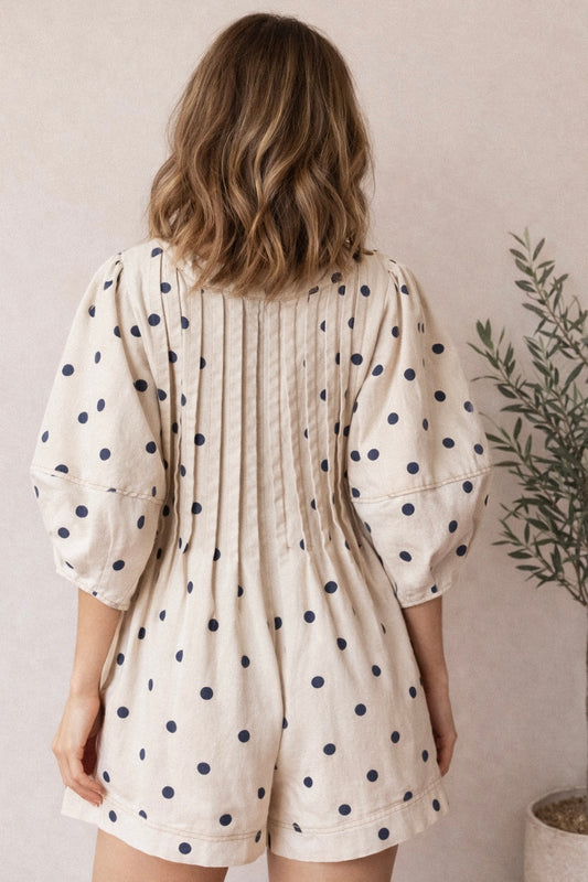 • Polka Dot Denim Bubble Romper - Cream/Navy